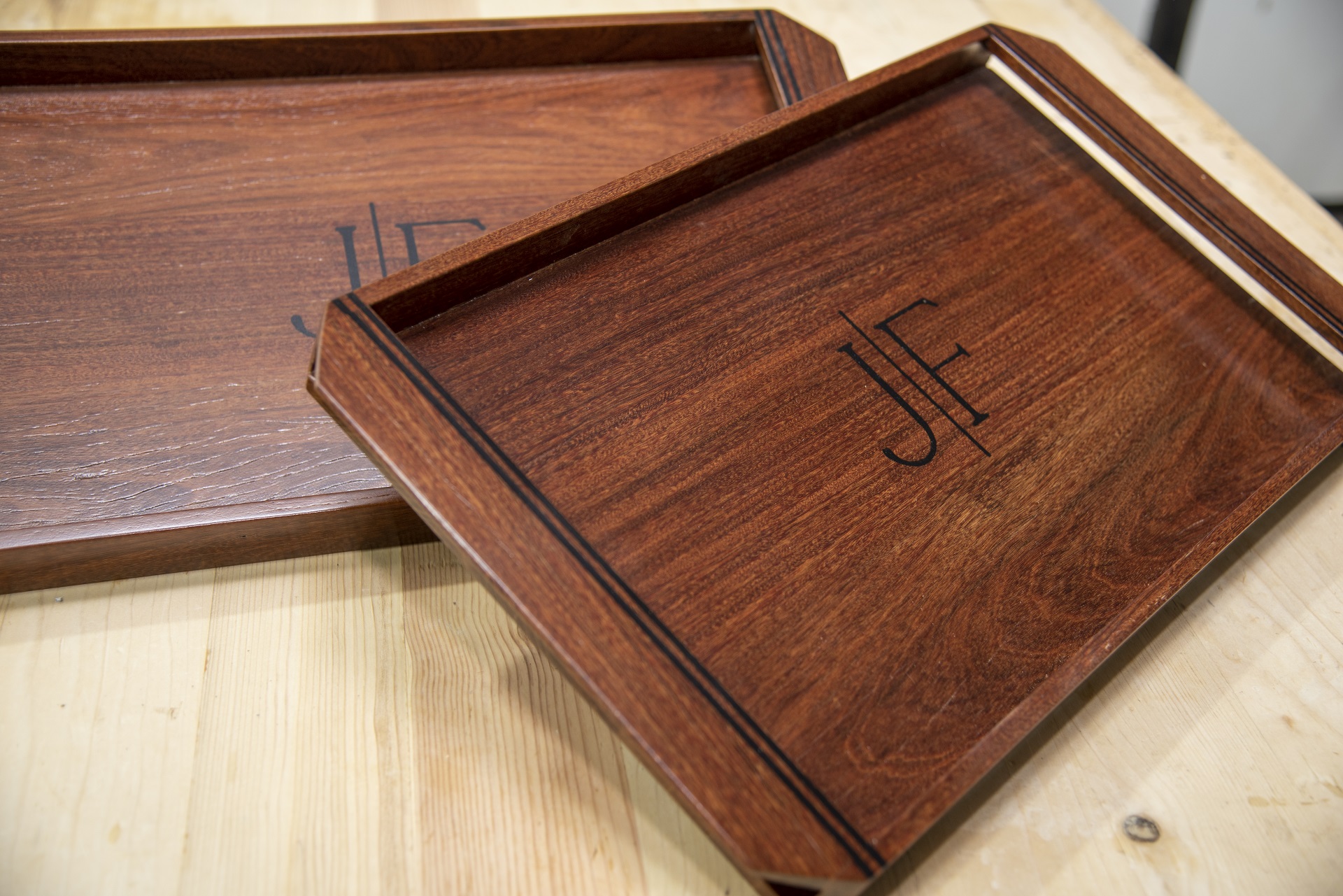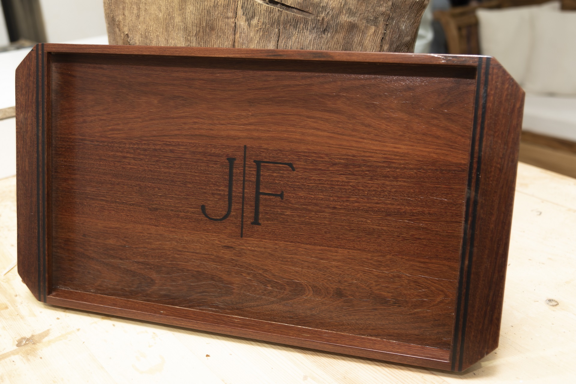 Bandejas personalizadas con iniciales. Realizadas en madera de ipé reciclada y resina.